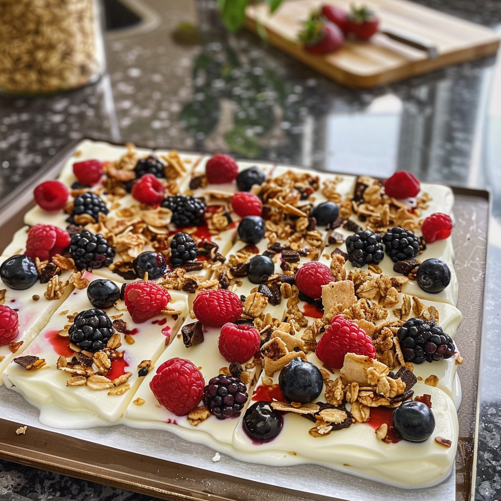 Start by spreading a layer of yogurt on a parchment-lined baking sheet. Add your favorite berries and granola before freezing until solid for the best results.
