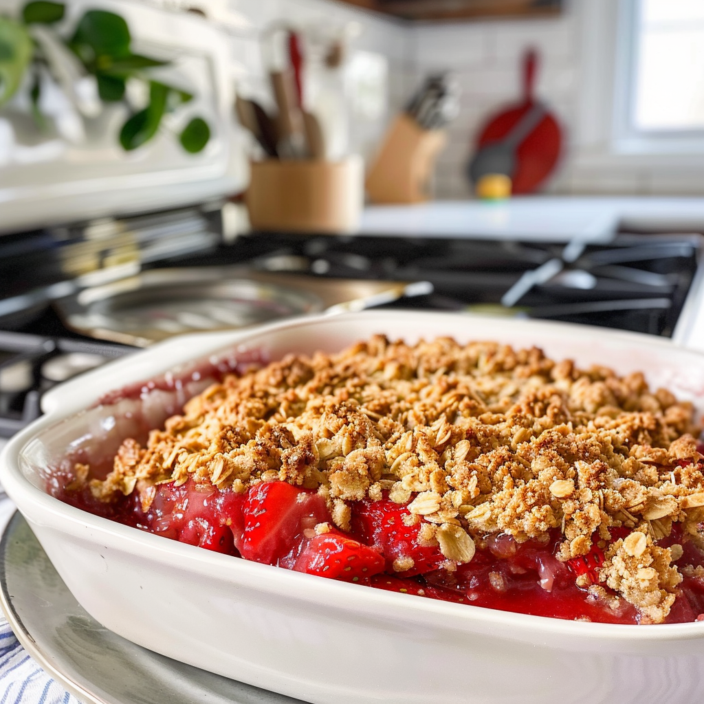 Start by preparing the filling while preheating your oven. Mix strawberries and rhubarb with sugar, then make the crisp topping. Bake until bubbly and golden for a perfectly balanced dessert.